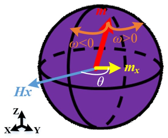 where θ is the angle between the unit magnetic moment and the external magnetic field in units of rad (unless otherwise specified, the magnetic field applied in this paper is in the X-axis direction, that is, the positive X-axis direction), and the value ranges from 0 to π. t is the simulation time, in units of ns. ω is the magnetic moment deflection angular velocity in units of rad/ns.