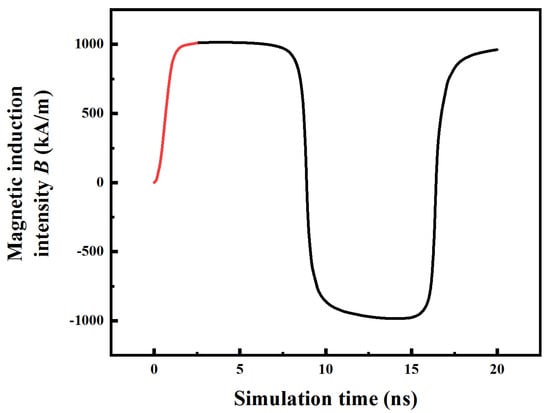 where B represents the magnetic induction intensity of the material in units of kA/m, t represents the simulation time in units of ns and v is the magnetization rate of the material, in units of kA/(m×ns).