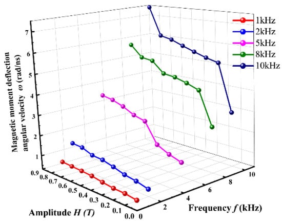 Previous studies have shown that magnetic moment deflection is mainly concentrated in the xy plane. Therefore, in the simulation process of exploring the magnetization saturation process of materials by an alternating magnetic field, an alternating magnetic field with a frequency f of 1 kHz–10 kHz and an amplitude H of 0.1 T–0.8 T was applied upwards in the square of X-axis. In the process of simulation, the distribution diagram of magnetic moment during magnetization is output through the graphical interface function of the software. Next, the included angle between each unit magnetic moment and the positive X-axis in the figure is calculated by the coordinates of the magnetization vector m. Then, take the arithmetic average of all the angles obtained to get the θ value at the corresponding time. Finally, the included angles at all times can be obtained by repeating the above steps, and the deflection angular velocity ω of the magnetic moment can be obtained through calculation of Equation (2). Table 3 lists the value of magnetic moment deflection angular velocity ω of material under the excitation of an alternating magnetic field, frequency f is 1 kHz–10 kHz and amplitude H is 0.1 T–0.8 T. Based on the data in Table 3, the variation curves of magnetic moment deflection angular velocity ω and alternating magnetic field frequency f and amplitude H are drawn, as shown in Figure 13.