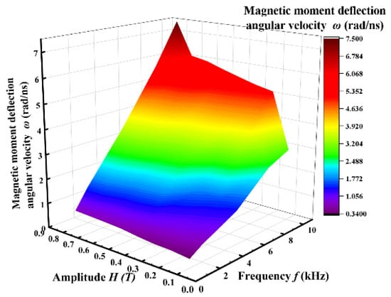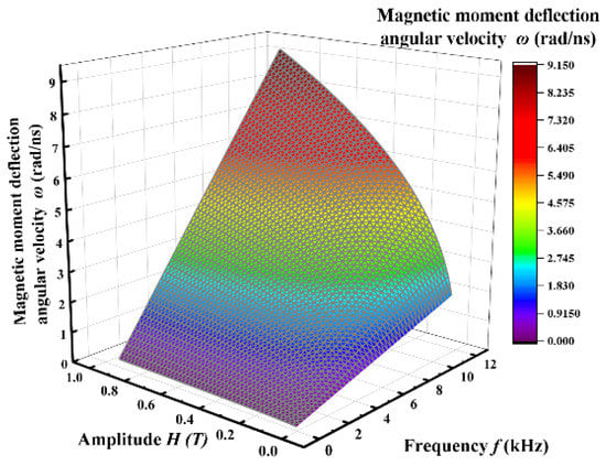 Figure 14 shows the three-dimensional surface where each curve in Figure 13 is located. It can be seen from Figure 14 that the deflection angular velocity ω is positively correlated with the frequency f and amplitude H of the alternating magnetic field. In addition, when the frequency f of the alternating magnetic field increases gradually, the effect of increasing magnetic moment deflection velocity ω is particularly significant. When the external magnetic field frequency f remains constant (1 kHz) and the amplitude H increases from 0.1 T to 0.8 T, the magnetic moment deflection angular velocity ω increases from 0.32 rad/ns to 0.73 rad/ns, with a growth rate of 128.1%. However, when the external magnetic field amplitude H remains unchanged (0.8 T) and frequency f increases from 1 kHz to 10 kHz, the magnetic moment deflection angular velocity ω increases from 0.73 rad/ns to 7.5 rad/ns, with a growth rate of 927.4%. Compared with the increase of amplitude H, the increase effect of frequency f on the increase of magnetic moment deflection velocity ω is particularly significant, and the increase rate of frequency f is about 7.24 times the increase rate of amplitude H.