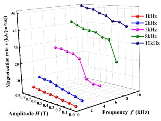 According to Formula (3), the magnetization rate v of the material can be calculated. Table 4 lists the magnetization rate v of the material under the excitation of an alternating magnetic field with a frequency f of 1 kHz–10 kHz and amplitude H of 0.1 T–0.8 T, and draws the change curves of the three according to the numerical values, as shown in Figure 17.