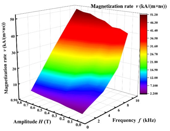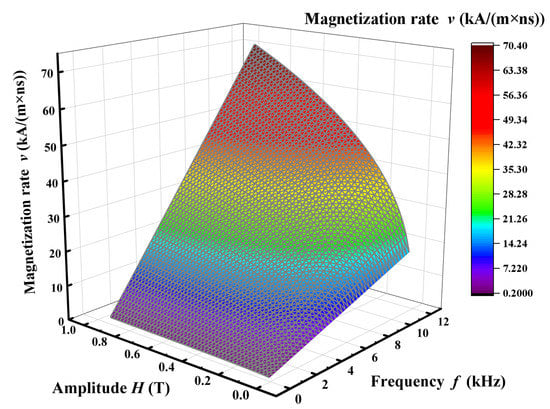 Figure 18 shows the three-dimensional surface where each curve in Figure 17 is located. It can be seen from Figure 18 that magnetization rate v is positively correlated with the frequency f and amplitude H of the alternating magnetic field. In addition, when the frequency f of the alternating magnetic field increases gradually, the effect of increasing magnetization rate v is particularly significant. When the external magnetic field frequency f remains constant (1 kHz) and the amplitude H increases from 0.1 T to 0.8 T, the magnetization rate v increases from 2.31 kA/(m×ns) to 5.86 kA/(m×ns), a growth rate of 153.7%. However, when the external magnetic field amplitude H remains unchanged (0.8 T) and the frequency f increases from 1 kHz to 10 kHz, the magnetization rate v increases from 5.86 kA/(m×ns) to 51.09 kA/(m×ns), a growth rate of 771.8%. The increase rate of magnetization rate v with increasing frequency f is about 5.02 times of that with increasing amplitude H.
