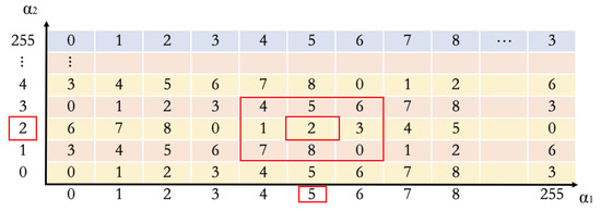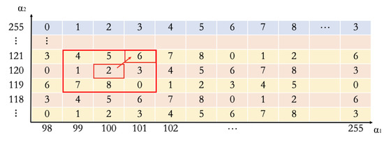 This section introduces the concept of the Sudoku matrix M [39], which represents the core of our solution. The size of the Sudoku matrix M is 256 × 256, as shown in Figure 1, calculated using Equation (1), where . As can be seen in the Figure 1, each pixel pair, represented by and , can be mapped to a core digit. Based on the core number, there are eight different independent numbers surrounding the core number without any repeated numbers. For example, if and , as shown in Figure 1, the core digit is 2, the surrounding eight neighboring digits are different from each other, and the range is between 0 and 8, excluding the number 2. By using the Sudoku matrix M, a pixel pair can be moved to a new pixel pair, which is represented by and according to the hidden number d. For example, if , and , obtained through Equation (2), will be 5 and 3, respectively. The maximum distortion of a pixel is 1 in order to maintain good visual quality after secret embedding.