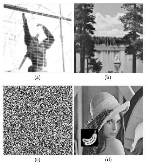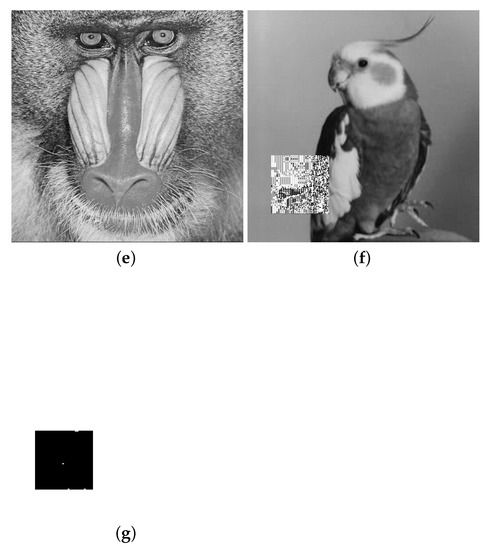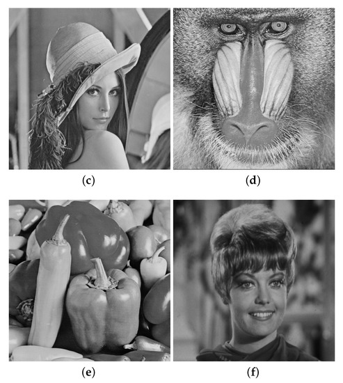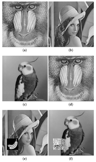 In the experiment, two secret images of size 256 × 256 pixels, as shown in Figure 7a,b, and four cover images of size 512 × 512 pixels, as shown in Figure 7c–f, were used. During the retrieval and authentication procedure, if the cover images were real, without evidence of tampering, we could reconstruct the full secret images completely, as shown in Figure 8a,b. To measure the visual quality of the cover images and reconstructed secret image, PSNR (peak signal-to-noise ratio) was used with Equation (12), where MSE (mean-squared error) was calculated with Equation (13), in which and were the values of the original pixel and that of the stego pixel located at location (i,j), and m and n were the size (height and width) of the image. Generally, the higher the PSNR value is, the better the visual quality will be. Furthermore, we evaluated the visual quality between the cover image and the shared image using the structural similarity (SSIM) of Equation (14), where and are the averages of x and y; and are the standard deviation values of x and y; and values and are two constant values, which are set to 1 s. If the SSIM value equals 1, it means that the two images are identical without any distortion. Visual quality comparisons of the shadow images shown in Table 1 demonstrate high visual quality. It is difficult to recognize the differences between cover images and share images.