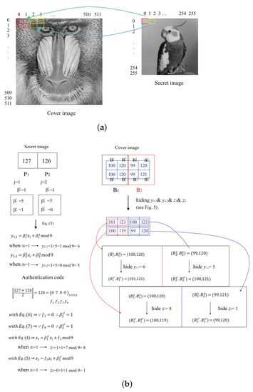 During the secret sharing procedure, first, the pixel value in the secret image needs to be converted to a base value of 9, denoted by , where is in the range of 0 and 3, and and are in the range of 0 and 8, and j are equal to 1 and 2 if the digits are generated by pixels and , respectively. Secondly, the and are embedded into the top two pixels ( and ) of the cover images with Equation (3). Here, the represents the ID number of the cover image.