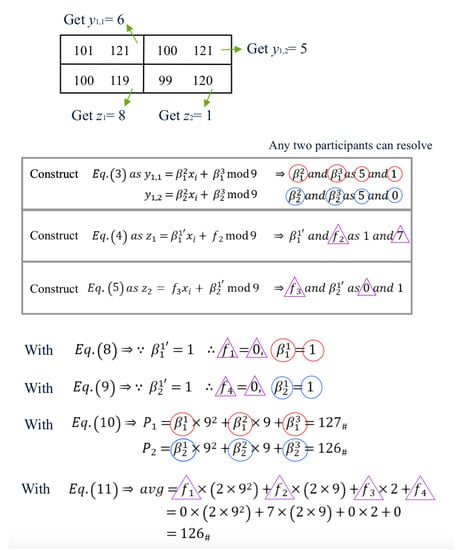 The values of and in Equations (4) and (5) can be reconstructed by mapping the stego pixel pairs (, ) and (, ). For the previous example, as shown in Figure 6, when inputting the participant , two equations can be reconstructed as mod 9 and mod 9. With any two participants, the parameters , , , and can be extracted. The values and can be computed with Equations (8) and (9), respectively.