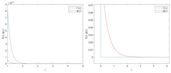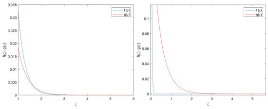 Left: , . Right: , . Representation of solutions, where is the asymptotic solution as per expressions (44) and (48) and is the numerical resolution of Equation (36). For (left), the global error between the analytical and numerical solution is ≤ for , while for (right), the global error is ≤ for .