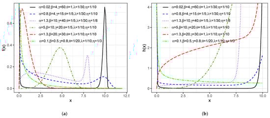 The expression of the failure rate function in Equation (2) is the sum of three Weibull failure rate functions. It is decreasing if , increasing if , and bathtub-shaped if or . Figure 1 shows the plots of the PDF and failure rate function of the 3CAW at selected parameter values. The 3CAW distribution has the PDF and failure rate function with flexible curves, and more importantly it has a long flat region of the bathtub-shaped failure rate function which is very important in reliability and biological studies.