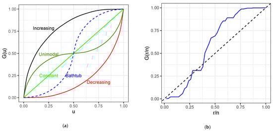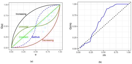 (a) Types of failure rate identify by shapes of the TTT-plot and (b) the empirical TTT-plot (blue) for Aarset data, where for , where , and its empirical version is for , where denote the i-th ordered observation.