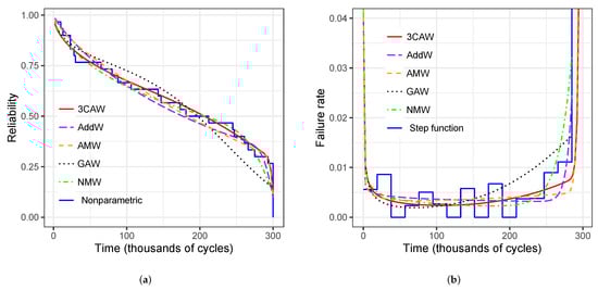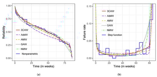 We provide the MLEs of the parameters of the given distributions in Table 9, and the numeric comparison between the given distributions, for fitting to Meeker and Escobar data, in Table 10. Figure 6 displays the visual comparison of the mention distributions by plotting the estimated reliability and failure rate functions. From these results, we see that the 3CAW provides a good fit to Meeker and Escobar data. Again, we can see that AMW performs similar to 3CAW. Even though it has a smaller value and a larger K-S value, its other values are still slightly less than that of 3CAW.