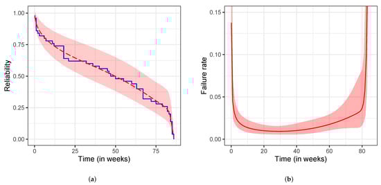 The 95% confidence interval for the estimated (a) reliability and (b) failure rate functions (red lines) of the 3CAW for fitting to Meeker and Escobar data. The blue line is the nonparametric estimate of the reliability function.