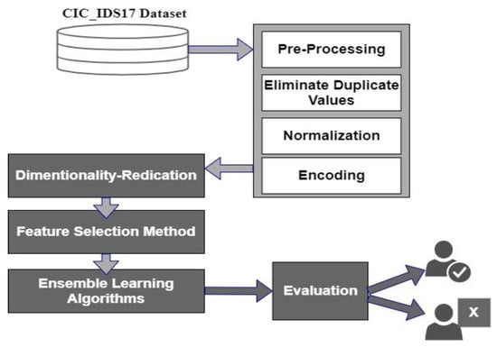 Every day, different types of new cyber-attacks are discovered, and their sources are becoming more hazardous. As a result, detecting zero-day attacks is a difficult operation that potentially jeopardizes business continuity [1]. Computer attacks are becoming increasingly complex, posing difficulties in accurately detecting the intrusion [2,3]. Network Intrusion detection systems (NIDSs) are meant to monitor computer networks for unusual activities that a regular packet filter would miss Traditional IDSs have a number of flaws, such as the inability to discriminate between new malicious threats; the need for modification; poor accuracy; and a high rate of false alerts. Therefore, machine learning is used to detect new attacks. However, machine learning encounters many challenges because it enhances the computational and time complexity of the task by expanding the search space [4,5]. Numerous studies have been conducted on the use of multiple classifiers instead of single ones and the principle of ensemble learning techniques to ensure high accuracy and a low false alarm rate [6,7,8]. As a result, ensemble learning can be divided into three categories (i.e., bagging, stacking, and boosting) [9,10,11]. It is a general meta approach to machine learning to combine predictions from multiple models to improve predictive performance. Although an infinite number of ensembles for any predictive modeling can be created, the subject of ensemble learning is dominated by three methods. The first category of the ensemble is bagging. It is the process of fitting multiple decision trees to different samples of the same dataset and then averaging the results [12]. Alternatively, the stacking method involves fitting many different model types onto the same data and using another model to learn how to best combine the predictions [13]. Boosting involves sequentially adding ensemble members that correct the predictions made by prior models and output a weighted average of the predictions [14]. Recently, researchers applied hybrid principles in feature selection and ensemble methods. Feature selection is a useful approach for intrusion detection systems. This method discovers extremely important features and discards unnecessary ones while causing minimal performance reduction [15,16,17]. Correlation-based feature selection (CFS) selects strong affinity on similarities that are used as a heuristic evaluation function. The function compares feature vector subsets that are related to the class label but are not associated with one another. The CFS algorithm implies that irrelevant characteristics have a low association with the class and should be removed consequently. Excess traits, on the other hand, should be investigated since they are typically associated with one or more of the other characteristics [18]. The classification algorithms used in ensemble learning frequently mix numerous basic classifiers in some fashion. The proposed work will benefit from this feature of ensemble learning by developing and integrating multiple distinct models, these classifiers are effective at dealing with the same problem and, when combined, produce a predicting output that is more stable and accurate. To begin with, a single classifier may not always be competent to produce the best representation in the hypothesis space. Thus, the use of multiple independent classifiers is necessary to improve prediction performance. Second, a false or inaccurate hypothesis can develop if the training dataset for the learning algorithm is insufficient.
