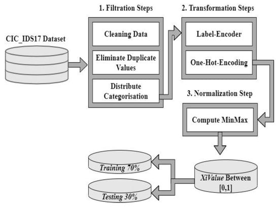 Figure 2 depicts the steps of this stage in detail. Processes at this stage are done on the CICIDS17 dataset that is formatted as CSV. In this stage, raw data is transformed into an analysis-ready format. This stage consists of three steps. These steps are: (1) filtration, when data is cleaned and duplicate values are removed; (2) transformation, when Label-Encoder and One-Hot Encoding techniques are applied; and (3) normalization, when minimax function is used to scale values between zero and one. The algorithm of this stage is explained in Algorithm 1.