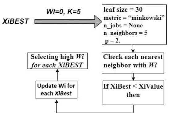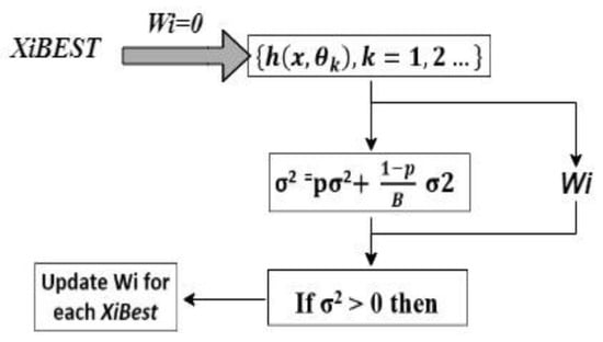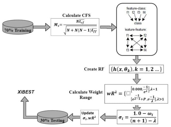 In RF, which has a minimal calculation cost, outliers and parameters have little impact. Furthermore, compared to a single DT, overfitting is less of an issue, and the trees do not need to be pruned [30]. With a volatility of two, the variance of an average of Bagging random variables has a 1/B2 volatility. The average variance is then computed using Equation (2), and if it is more than zero, the weight Wi for each subset feature is updated (XiBest).