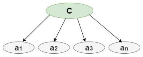 Class variable (C), and a set of attributes F = {; ;…; }, on a dataset D which consists of instances {, ,…, } and can be defined as in Equation (3), assuming the that the attributes are independent within the class as in Equation (4). Figure 4 demonstrates the structure of Naïve Bayes [32], where C is the classifier and A1, A2, … are the attributes.