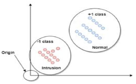 By optimizing rule f, SVM changes the hyperplane to find a linear classifier. A mark can be assigned to a test example x using this classification law. If the result of f(x) is less than zero, x is classified as an intrusion; otherwise, it is classified as natural. As presented in Figure 5, the classification situation can be clarified by the product of f(x): Positive is classified as regular, and negative is classified as an intrusion.