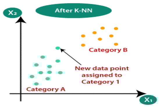 According to the distance function, the nearest neighbor classifier (NNC) assigns a class to the given test pattern that is the same as its nearest neighbor in the training set. The k-nearest neighbor classifier (k-NNC) is a generalization of NNC, where k is an integer and k = 1. The training set contains k-nearest neighbors for the given test pattern Y. Each of the k closest neighbors’ class information is maintained. In most circumstances, NNC using bootstrap samples outperforms traditional k-NNC according to experiments. It is worth noting that there is no theoretical explanation for why k-NNC, which uses the bootstrapped dataset, is better [35]. Figure 6 depicts KNN.