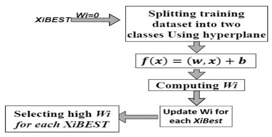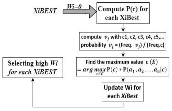 Figure 9 depicts the process of computing the probability of each subset feature (XiBEST) and finding the maximum values to update the weight of each XiBEST.