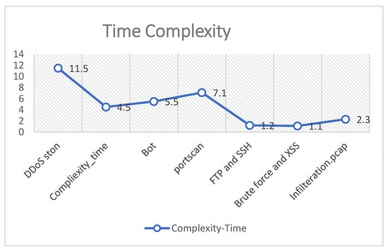 The time complexity of the proposed algorithm using Big O notation is O(N2) [28]. This means the run-time increases polynomial when the input is increased. The complexity time when applied to the CICIDS17 dataset is presented in Figure 11. It shows that the highest runtime is 11.5 s for DDoS_ston class, while the shortest runtime is 1.1 s for brute force class.