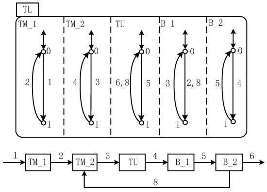 As its STS model is depicted in Figure 5, is an AND superstate and its components , , , , and are parallel, implying that the system work at these states simultaneously. is an OR superstate and its components and are exclusive, which means only one of and can be reached at a time. So as , , , and . The occurrence of events promotes the transition between these states. For the shared events, such as 2, if 2 occurs, the states and transfers to and simultaneously. Other events can always occur if the system reaches the trigger states. For example, event 1 can occur once stays at . Thus, to display the behavior of the system, can be given as follows:
