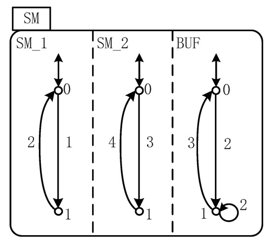 This example shows how to achieve the aim of resolving the control problem of the Small Factory based on SFBC. First, the STS model is shown in Figure 7, where the BUF contains a buffer with one slot. The two states of SM are represented as 0 and 1, where 0 stands for “idle” and 1 for “working”. In the initial state, the buffer is empty. SM can work from the infinite input bin (Event 1), after which M1 completes the work cycle (Event 2). The operation mechanism of SM is basically the same. Odd numbers represent controllable events and even numbers represent uncontrollable ones. After that, BUF needs to complete the following two tasks: first, when event 2 takes place, the workpiece will be placed in the buffer; secondly, when event 3 takes place, the workpiece is transferred to SM.