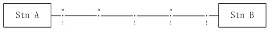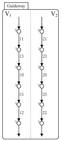 A and B are two stations on a single track guideway. There are four sections between A and B, as shown in Figure 9, with the symbol “·” representing the guideway between two sections and “*” showing that the section junctions install spotlights. If there are two vehicles and running on this guideway, the use of the spotlights prevents collision by ensuring that and never travels on the same section simultaneously.