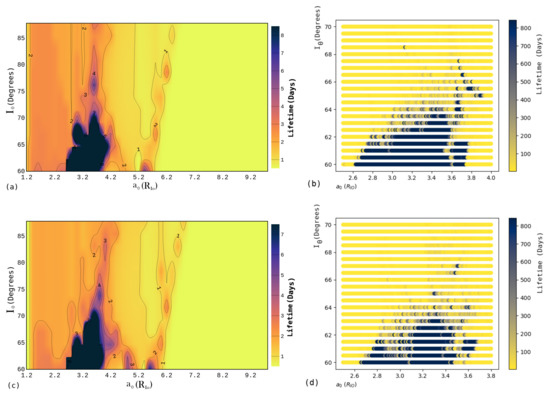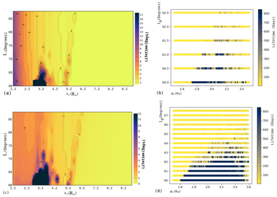 Orbits that survived the total integration time were also found with an initial semi-major axis equal to , Figure 4b,d. These orbits are among the conditions obtained in the range of for the initial eccentricity and inclination between 60 and degrees, and and . For both conditions, the initial inclination was degrees. In this range, orbits that collided with Io or escaped from the region of interest have lifetimes between 26 days and years.