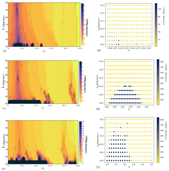 For the cases with initial eccentric orbits, for to , the results also showed similar behaviors. The darker regions in Figure 1c, Figure 2a,c correspond to regions where some orbits survive for the total integration time. As an example, in the case of , Figure 1c, the results show that this region lies in the range between and to the semi-major axis and an inclination interval of 60–67.5 degrees. For initial eccentric orbits with , as shown in Figure 2a, the best times obtained are in the range of the initial semi-major axis between and , and it covers the inclination range from 60 to 70 degrees. In terms of lifetimes, those orbits that did not survive the total time of integration of years; they lasted up to 824 days for , as shown in Figure 1d. For , we had orbits lasting between 10 and 816 days, as shown in Figure 2b, and orbits lasting up to 834 days, for , as shown in Figure 2d.