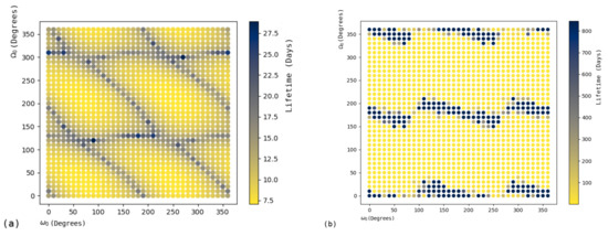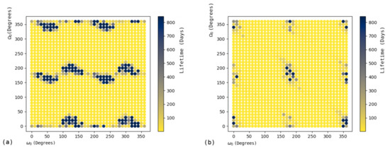 The results show that depending on the combination of and , the lifetimes of the orbits may increase or decrease compared to the cases assuming degrees and degrees. These gains and losses in the lifetimes were found in all simulated cases, as shown in Figure 5 and Figure 6. As an example, for degrees and degrees, as shown in Figure 5a, and degrees and degrees, as shown in Figure 6a, orbits with 28 and 789 days were found. This correspond to an increase of 14 and 560 days, respectively. In some cases, in the maps shown in Figure 5a and Figure 6b, it was possible to obtain orbits that survived during the total simulation time, years. Two examples can be seen in the interval of 350–360 degrees for the argument of the pericenter and longitude of the ascending node of 20 degrees in Figure 6b and the range of 140–150 degrees for the argument of pericenter and longitude of the node of degrees, as shown in Figure 5a.