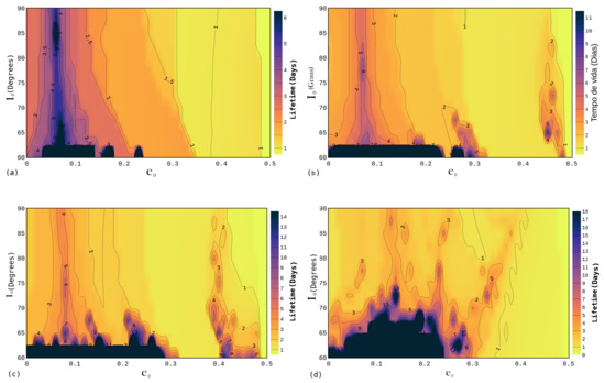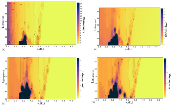 For the initial semi-major axis of , as shown in Figure 3a, these behaviors can be seen since longer lifetimes are in regions of smaller inclinations, 60 degrees, and circular orbits. However, the lifetimes of these orbits are no longer than 14 days. Likewise, the orbits implemented with an initial semi-major axis equal to , as shown in Figure 3b, did not also present orbits with a duration greater than 15 days. Orbits with longer times were located in regions of low inclination, 60 degrees, and for nearly circular orbits with . The maps in Figure 3c,d show the results for a semi-major axis of and , with orbits with maximum times of 14 and 6 days, respectively.