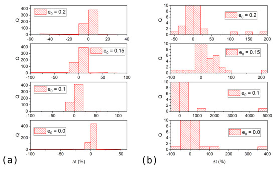 Histograms of the percentage of gains or losses in the lifetimes considering simulations as a function of and for the initial semi-major axis values , and . The plot in (b) shows a clipping up to over the total histogram in (a). Each histogram has a fixed eccentricity for the entire simulation.