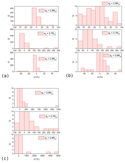 Histograms of the quantities of orbits, Q, by percentage of gains or losses in the lifetimes of the orbits as a function of and for the initial semi-major axis , and . The histograms in (b,c) zoom the total histogram showed in (a).