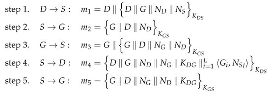 In step 5, S sends the message . The message is decrypted by G, and the values G, D, , and are compared with the corresponding ones in messages and . If the values are equal, is accepted as a fresh session key. By the end of this step, is established as a secret session key shared between D and G and session communication can proceed.