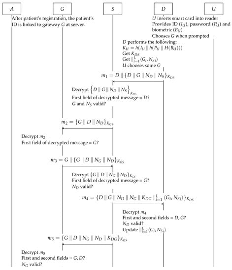 When the initialization phase has been completed, authentication can be executed. This starts with a doctor U inserting their smart card device D in a reader and entering their ID and password . Furthermore, their biometric is captured. The smart card computes the value of the key and is able to obtain the value of if . Consequently, the list of gateway ID’s is obtained by decrypting the corresponding cipher text, and the doctor is prompted to choose one of their patients to monitor. Then, a sequence of communication steps is executed between the smart card device D, the server S and the IoT gateway G on the patient’s body. These steps are shown in Figure 2. Interaction between protocol parties is also illustrated in Figure 3.