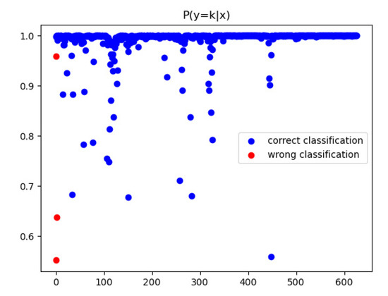 In the process of pseudo-label learning, to retain samples with good classification performance, we used the experimental data to verify that, after SoftMax function screening, the samples whose probability value was greater than 0.7 had high classification accuracy. The detailed experiment of probability P is illustrated in Figure 3.