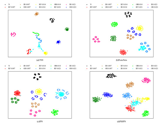 Figure 9 shows feature visualization via t-SNE, showing that CNN could not clearly distinguish different fault classes. ProtoNet and IPN performed better thanCNN: the distance between features of different classes was as large as possible and the features in the same classes were close to each other. However, some features from different classes were still close to each other. Our proposed method is relatively more accurate than the others in t-SNE. In our method, different classes have well-defined boundaries.