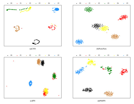 Figure 6 illustrates the feature visualization produced for t-SNE. In CNN, the difference in some classes was clear, but several features were indivisible. In ProtoNet and IPN, different samples were successfully distinguished, but the result was messy. The results produced by PSSPN were more clearly divided than that of the other considered methods, though the boundaries of some samples were ambiguous. Possible reasons for this include the amount of data being relatively small, and the model could not be further improved; or the difference between the samples being small, and our model could not distinguish this gap.