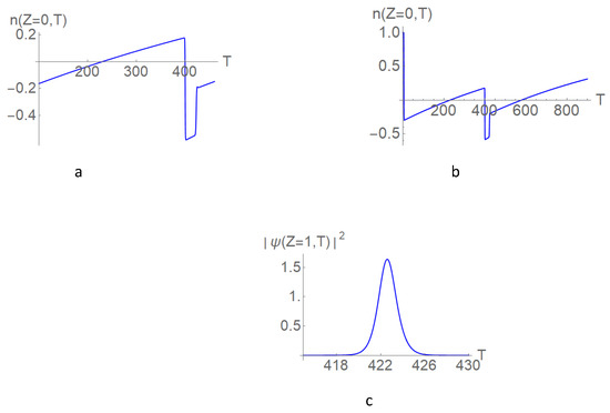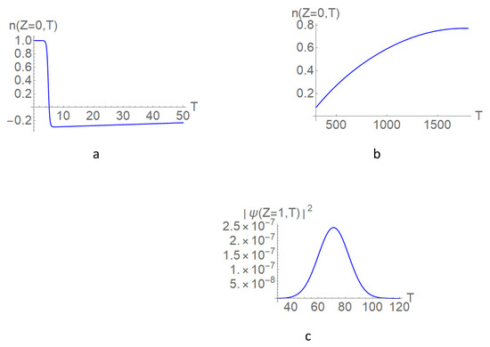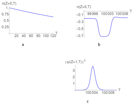 (a–c) = 100,000 and . Same parameters as in Figure 3 except that has been set slightly lower than . The Aurora following the “reading pulse” does not take place (b,c).