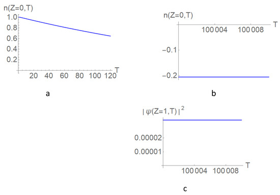 However, suppose that instead of the first pulse, we apply the dc pump at (, ). The dc pump is much weaker () than the pulse would have been, but it continues to operate. (The tanh function multiplying in (9) serves only the purpose of softening the discontinuity which might generate irregularities in the calculations. For practical purposes, we may think of it as a step function.) Under this continuous influence, n decreases exponentially (Figure 3a) at the rate toward the threshold level −0.2, at which the dc pump is just strong enough to prevent the decay toward ground. By maintaining the dc pump, one can prolong the excited state indefinitely in the ideal slab environment.