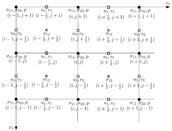 A similar grid was used in [18] to avoid the appearance of oscillations in the solution functions when using central differences on an unstaggered grid. We chose the location of the nodes on the distributed grid in such a way that the longitudinal components of the velocity vectors and are determined by the direction of the variable , i.e., and are defined at the nodes , and the transverse components and of the indicated vectors are determined in the direction of the variable , i.e., in nodes , the diagonal components of , the stress tensor and pressure are in nodes , the off-diagonal component is in nodes .