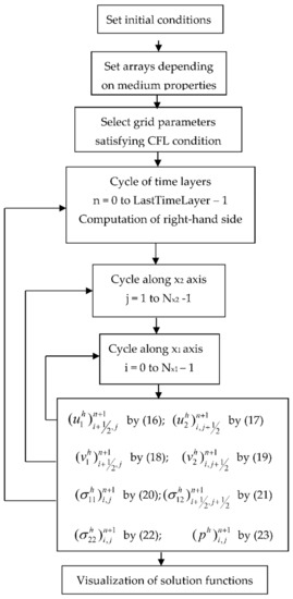 To find a numerical solution of the dynamic problem for the poroelasticity Equations (7)–(15), a discrete analogue is constructed. An algorithm for computing a solution based on an explicit scheme is built on a uniform staggered grid using the finite difference method.
