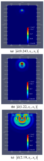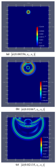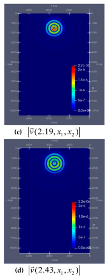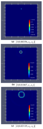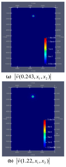 Figure 5 and Figure 6 show the dynamics of the modulus of the vectors and from time s. to s. with certain time intervals. The computational process in this experiment took 34 min.