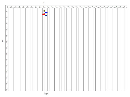 We define an algorithm for the numerical solution of the problem as follows. Let the values of the grid functions on the -th time layer be known. Then the transition to the -th time layer is carried out according to explicit Formulas (16)–(23), and due to the boundary conditions, the calculation of grid functions , and according to Equations (21)–(23) starts from the lower left corner of the computational grid, and calculation of grid functions , , and by Equations (16)–(19) from the upper right corner. The algorithm of numerical solving of the grid functions is shown on Figure 3.