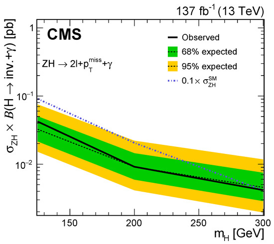 - CMS Collaboration. Search for invisible decays of the Higgs boson produced via vector boson fusion in proton-proton collisions at = 13 TeV. Phys. Rev. D 2022, 105, 092007. [Google Scholar] [CrossRef]