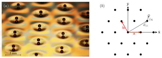 Throughout this work, we choose physical parameters for the drop and bath liquids corresponding to silicone oil with kinematic viscosity , density , and surface tension , which have been widely used in experimental and theoretical studies of droplet–droplet interactions [,,,]. In a deep bath vibrating vertically at , such a fluid will be characterized by a Faraday wavelength and Faraday threshold , where g denotes the gravitational acceleration. We assume that all droplets have radius and bounce in phase with each other at the Faraday period in the higher-energy mode, as assumed in the prior analysis of free rings []. An example of a triangular droplet lattice constructed in the laboratory is shown in Figure 1a.
