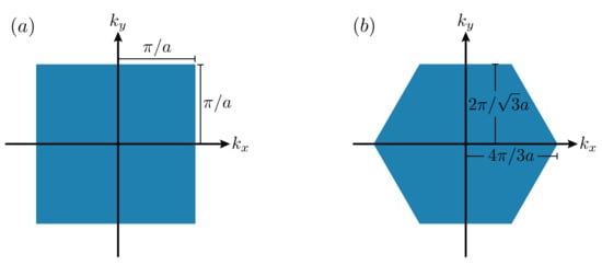 an oscillation characterized by wavevector . Therefore, and result in the same physical oscillation. It thus suffices to consider only wavevectors in the lattice’s so-called Brillouin zone, defined as the smallest set of required to describe all distinguishable vibrations of the discrete lattice []. The Brillouin zones for the square and triangular geometries considered in Section 3 are illustrated in Figure 2, and the procedure for generating the Brillouin zone for a generic Bravais lattice may be found in standard reference texts on solid-state physics [].