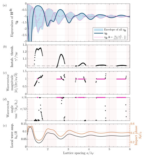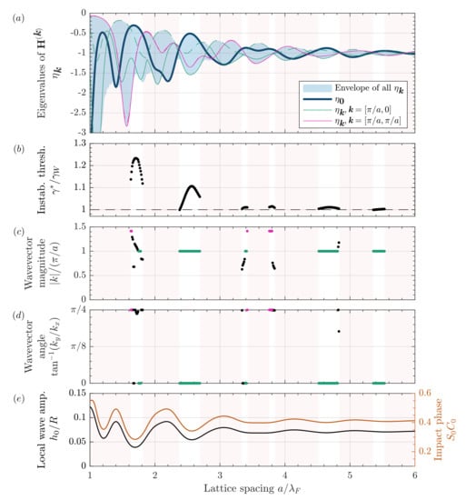 Based on Equation (26), we now have a simple procedure for assessing whether a square or triangular lattice is unstable at the initial vibrational acceleration , which is below the walking threshold of a single drop and corresponds approximately to the lowest at which the droplets bounce in a period-doubled mode []. Specifically, we compute the eigenvalues and of (Equation (19)) numerically, noting that there are two for each wave vector in the Brillouin zone, and plot their dependence on the lattice spacing a for both the square (Figure 3a) and triangular (Figure 4a) lattice geometries. Intervals of a where for all are shaded in red, indicating that the lattice is already unstable at . We observe that for both the square and triangular geometries, there are only discrete intervals of a for which the lattice is initially stable, which roughly correspond to geometries in which drops bounce in minima of the local wave amplitude (see Figure 3e and Figure 4e). We note that this behaviour is in accord with previous studies reporting that bound states are most stable when each drop bounces in a minimum of the net wavefield produced by its neighbours [,]. Thomson et al. [] found similar swaths of initial instability as a function of the lattice spacing for infinite one-dimensional droplet chains at low vibrational accelerations, which they referred to as ‘geometric instabilities’.