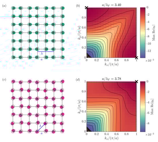 where is the unique (repeated) eigenvalue of . Geometrically, Equation (24) signifies that the curvature of the local wavefield beneath each droplet in the square and triangular base lattices is isotropic, having the same value in all horizontal directions. Using Equation (24), the general dispersion relation (18) reduces to the simpler eigenvalue problem,