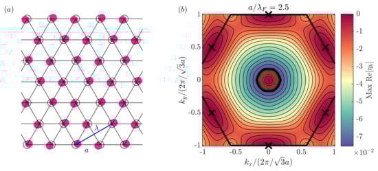 Common vibrational mode of the triangular lattice. (a) An illustration of the wave mode highlighted by magenta markers in Figure 4, corresponding to the out-of-phase oscillations of neighbouring planes along a line 30 degrees to the horizontal, with wavelength . (b) The maximum real part of the eigenvalues for the lattice spacing . The Brillouin zone boundary is traced in black (see Figure 2b), and crosses indicate the most unstable modes: and rotations thereof.