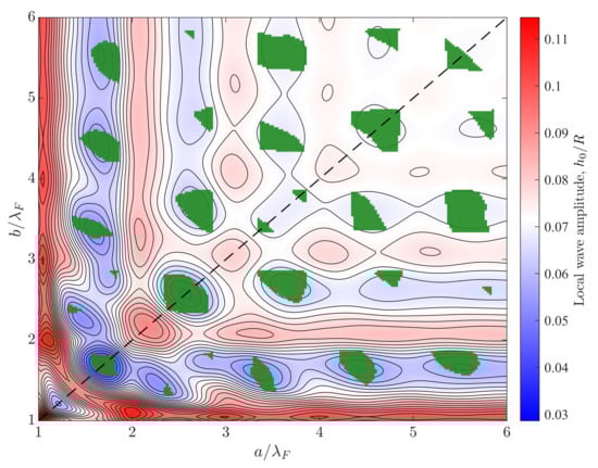 The rectangular lattice is parameterised by two lattice spacings, a and b. Regions of initial stability at low memory are shaded in green. All other lattices are geometrically unstable. The colourmap corresponds to the local wave amplitude beneath each drop , normalized by the drop radius R. Stable regions are roughly correlated with minima in . The diagonal line corresponds to the square lattice, where the regions of initial stability correspond to those presented in Figure 3.